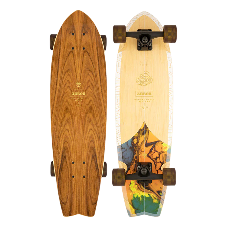 The Arbor Sizzler Groundswell Cruiser Complete is a swallowtail thruster for slashing banks, powering down any line, or carving tight pocket turns.
