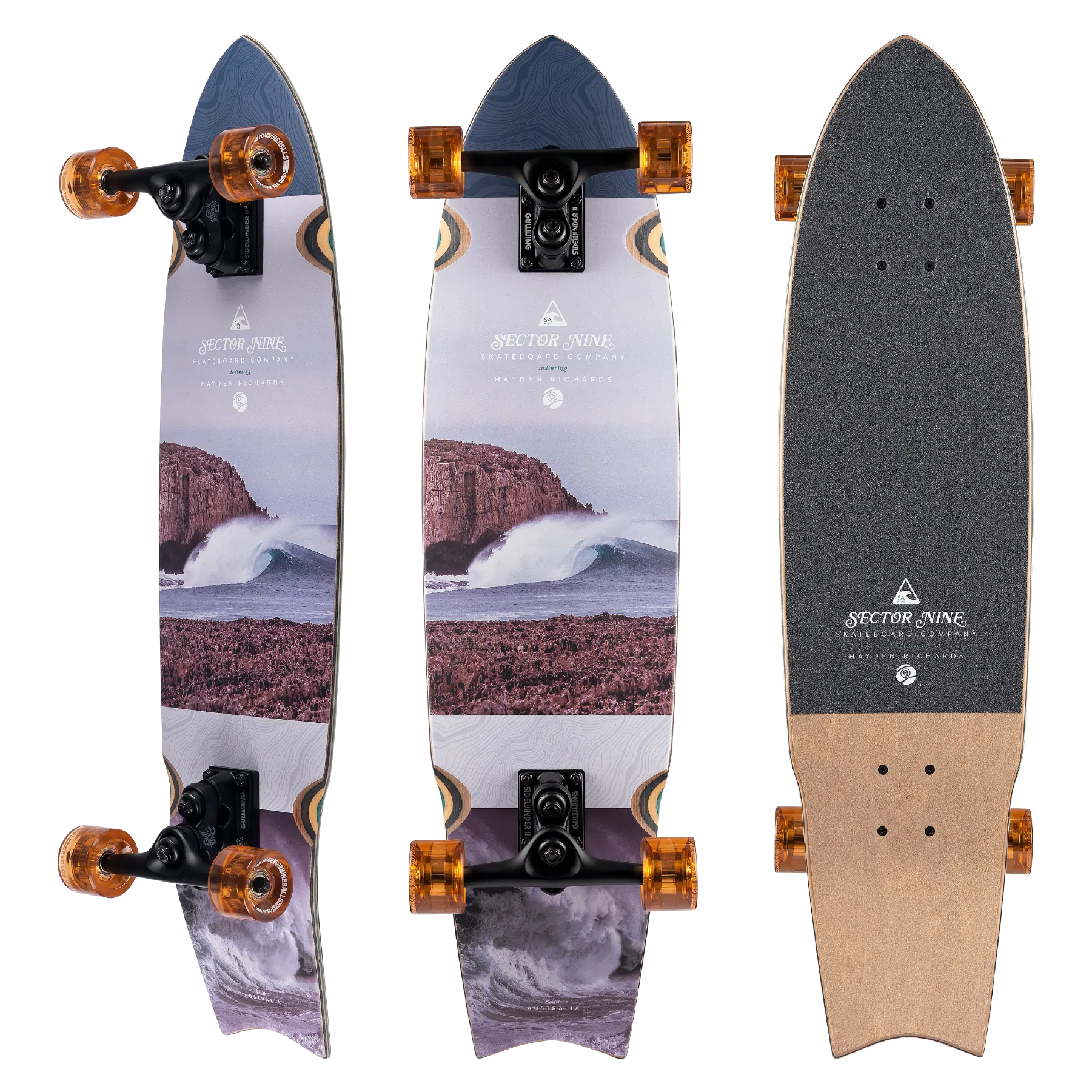 The Sector 9 Unagi Rips Longboard Complete features photographer Hayden Richards a.k.a. Rich Richards a.k.a. SA Rips. Hailing from South Australia, his photography is stark contrast to the bright, colorful, sun-soaked barrels you’re probably accustomed to seeing don our decks. The moody, serene and often dark images of barren stretches and isolated landscapes are punctuated by ocean views and perfect barrels. We’ve chosen to compliment the subtlety of his images with flat, matte bottom graphics on some surf-inspired shapes like the Jammer and Unagi, as well as an all-around favorite in the Meridian. We’re super stoked to show off his incredible images with this collection that’ll have you transported to the other side in search of ocean perfection.