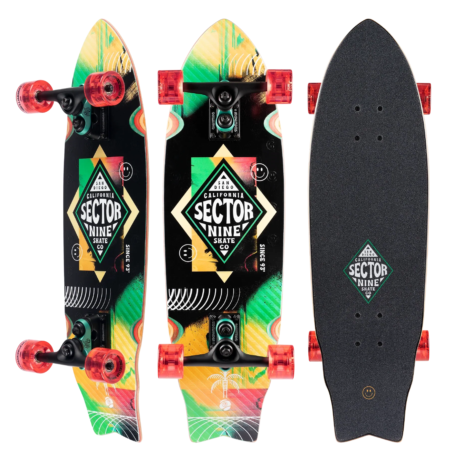 The Sector 9 Wavepark Party Cruiser Complete is the perfect grab and go for getting loose! That’s what skateboarding is all about, just having a good time and moving the party that’s in your head to under your feet. Art from long-time designer, Josh Smith, looks to capture just that with bright graphics contrasted against stark, black areas and easy-going color palettes. There’s a little hidden party favor to boot, as each deck features raised under prints with some lively patterns underneath. The Hopper, Wavepark and Ledger shapes make the Revel Collection the perfect beachfront bangers.